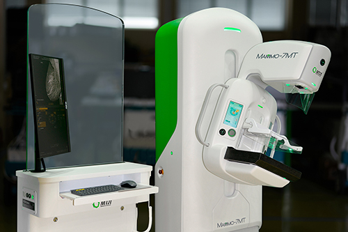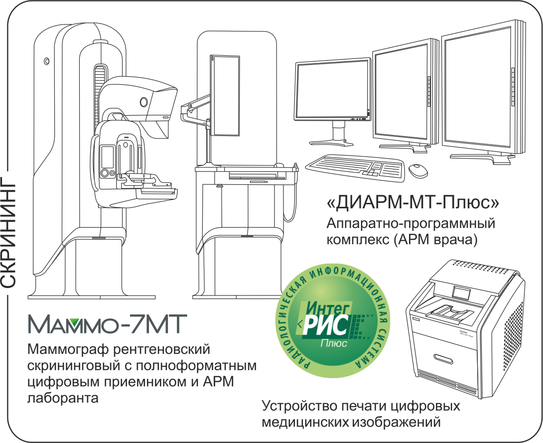 | Высокая точность диагностики Современный приемник с высоким пространственным разрешением обеспечивает исключи-тельное качество изображений, необходимое для выявления даже малозаметных изменений в тканях молочной железы. Функция съёмки с увеличением значительно повышает точность диагностики, особенно в сложных случаях. Максимальный комфорт Эргономичный дизайн «Маммо-7МТ» включает плавные линии корпуса, защиту лица пациент-ки и удобные ручки на С-дуге, что делает процедуру максимально комфортной и безопасной. Регулируемая система компрессии с индикацией силы сжатия снижает дискомфорт, а функции автоматической и ручной декомпрессии упрощают работу оператора. Безопасность «Маммо-7МТ» оснащён системами защиты от излучения, которые минимизируют радиационное воздействие на пациенток и медицинский персонал. На кожухах аппарата установлены датчики касания, предотвращающие столкновение С-дуги с препятствиями, что исключает риск травм. Высокая мощность и производительность Рентгеновское питающее устройство (РПУ) высокой мощности сокращает время исследований, сохраняя качество изображений. Это обеспечивает высокую пропускную способность при обслуживании большого потока пациенток. Интуитивное управление Аппарат оснащён пультом управления с двумя цветными графическими LCD-дисплеями и понятным интерфейсом на русском языке. Это упрощает работу оператора, делает процесс эксплуатации удобным и снижает время на обучение. Продуманная конструкция «Маммо-7МТ» оснащен педалями для удобного управления компрессией и декомпрессией. Возможность съемки при нулевой компрессии (онкорежим) расширяет диагностические возможности. По желанию заказчика рентгеновский скрининговый цифровой маммографический аппарат «Маммо-7МТ» может поставляться в различных комплектациях.